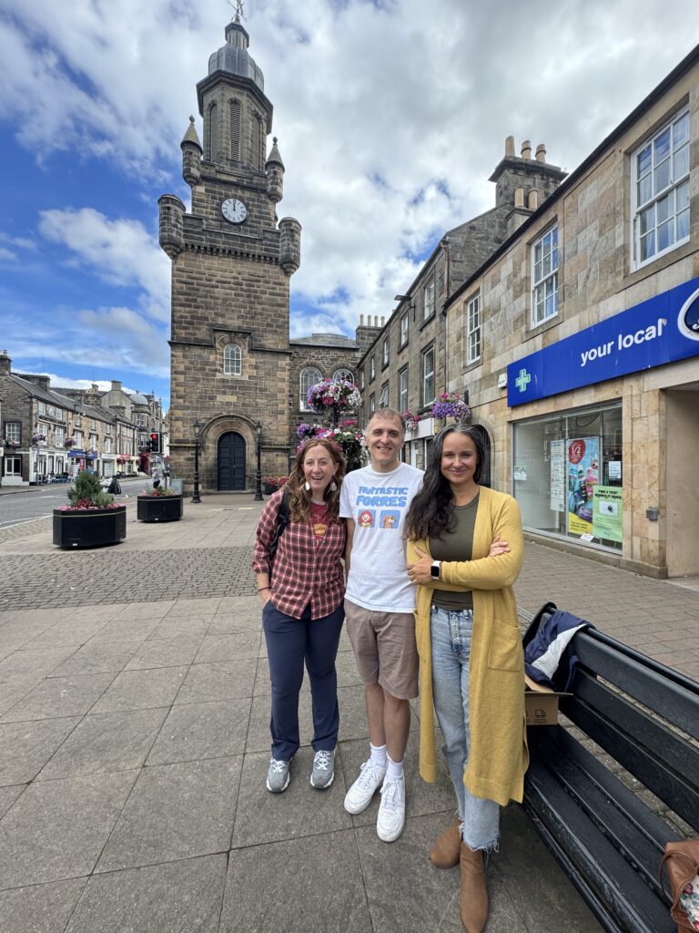 While admiring the panoramic view from the top of the tower, I looked down and saw Ewen Watson, our next appointment, waiting patiently on the bench down below, so Taryn and I hurried down to say โhelloโ. The talented, friendly author of Fantastic Forres had graciously agreed to meet us and bring us the books we wanted to bring back! He & his talented partner have also come out with Forres coloring books, tote bags, post cards, notebooks, and most recently, a map for walking tours of Forres! (We brought back a couple of each item, so make sure you watch for them in our Highland Hootenanny raffle baskets in November!)